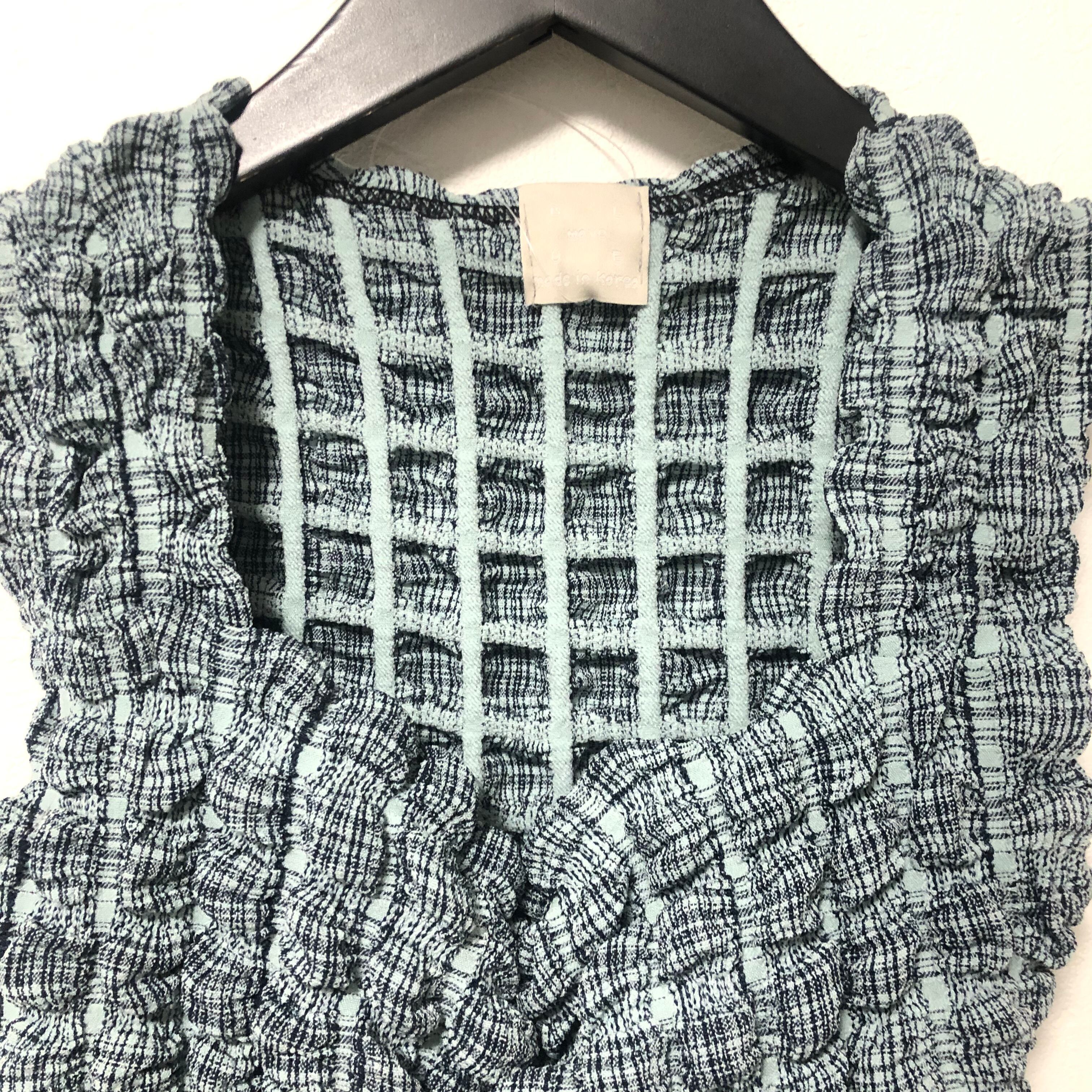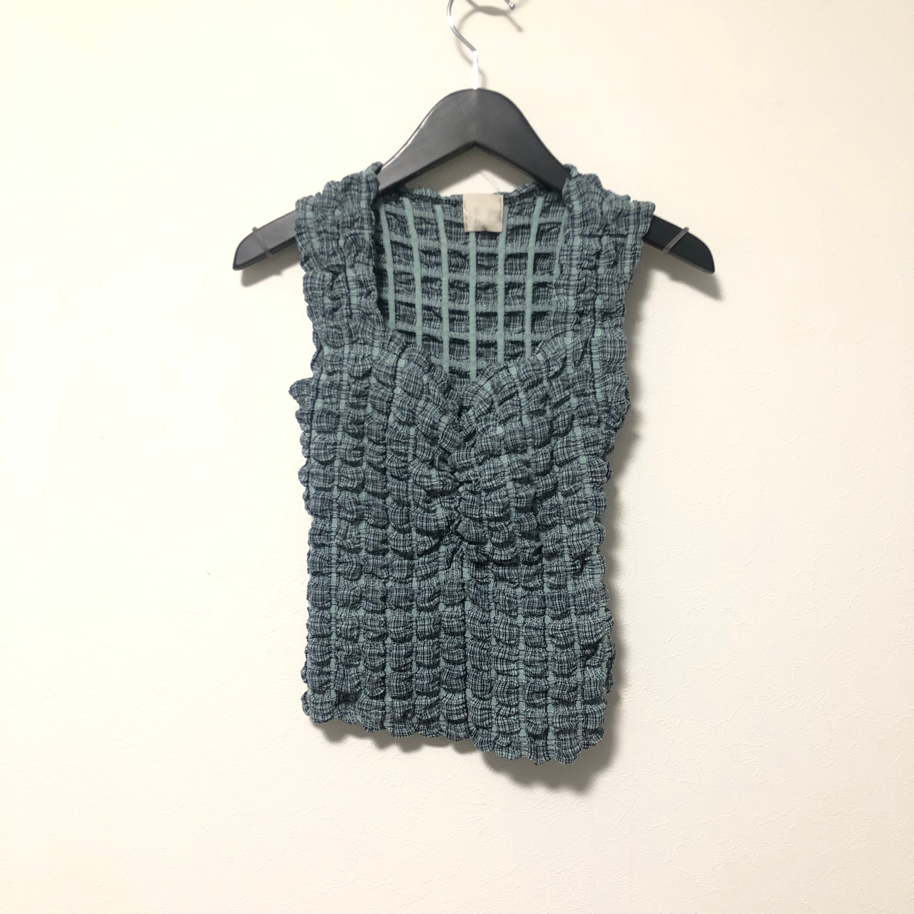 細かいチェックのポップコーン加工生地でコンパクトに仕上げたトップス。